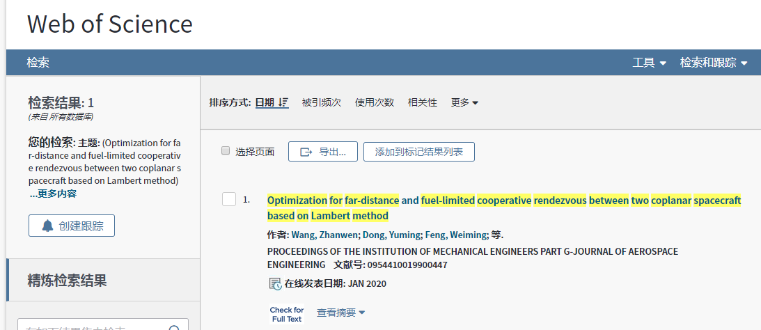 工程力学专业本科生汪展文和董禹铭在英国《航天工程期刊》(Proceedings of the Institution of Mechanical Engineers, Part G: Journal of Aerospace Engineering)发表了题为《基于Lambert方法的共面航天器远程协同交会的优化》的论文,并被SCI收录。