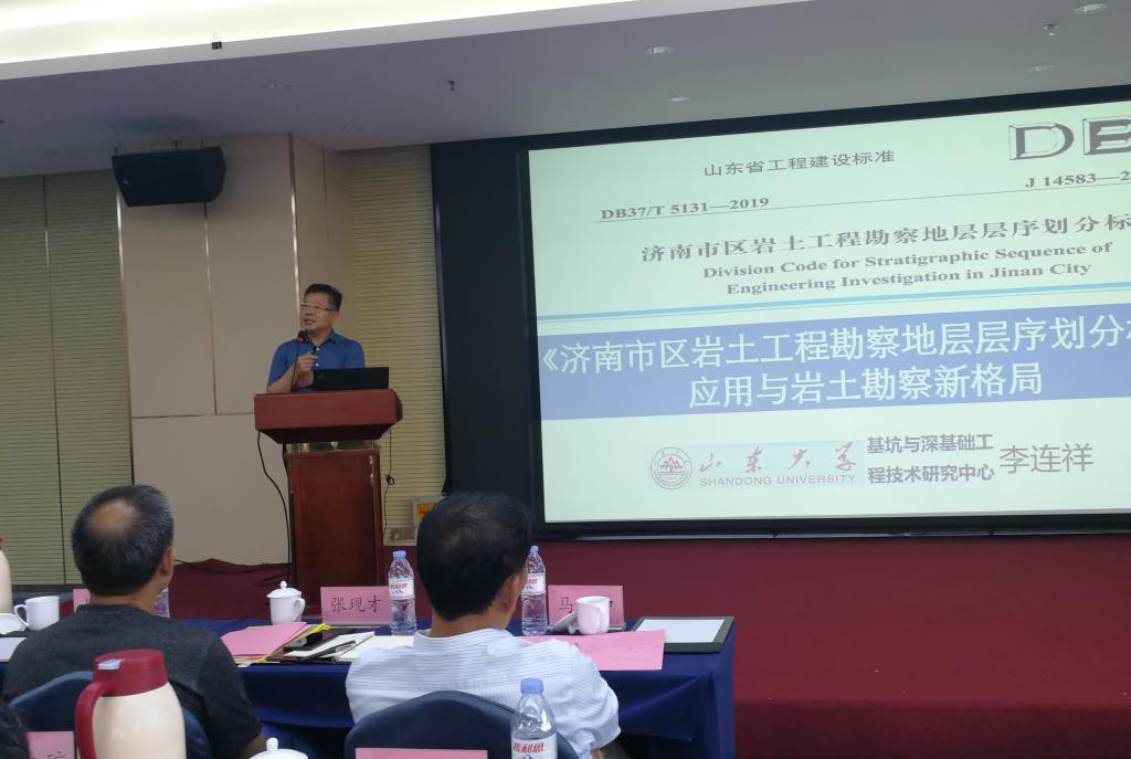 基坑与深基础工程技术研究中心主任、博士生导师、山东省工程建设标准《济南市区岩土工程勘察地层层序划分标准》(DB37/T5131-2019)主编李连祥做了“济南地层标准应用与岩土工程勘察新格局”的主旨演讲。