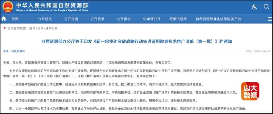 6月18日,国家自然资源部网站发布《新一轮找矿突破战略行动先进适用勘查技术推广清单(第一批)》(自然资办函〔2025〕1340号),bilibili