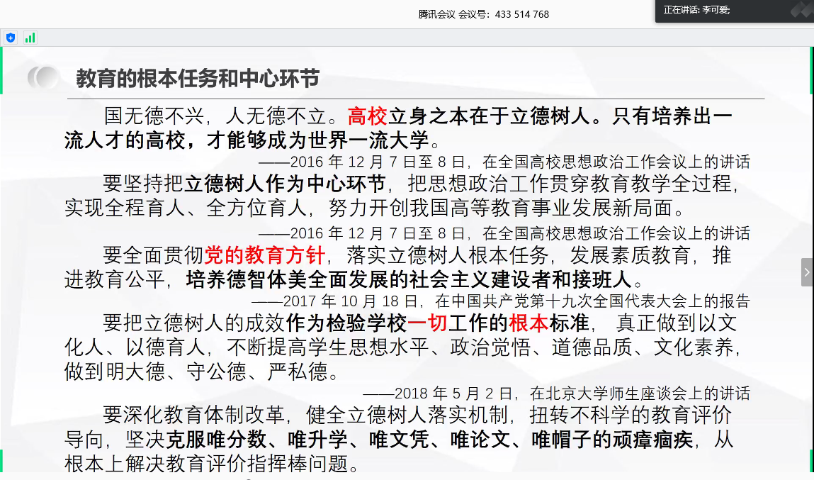 首先,李珂介绍了此次会议的主要内容并向大家介绍“习近平总书记关于教育的重要论述”。教育的根本任务是培养德智体美劳全面发展的社会主义建设者和接班人。教育要坚持把立德树人作为中心环节,把思想政治工作贯穿教育教学全过程。