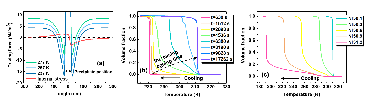 图3. (a) 沉淀相附近的化学驱动力和内应力贡献的相变驱动力比较图。(b)不同时效时间和(c)不同初始成分对马氏体相变动力学的影响。