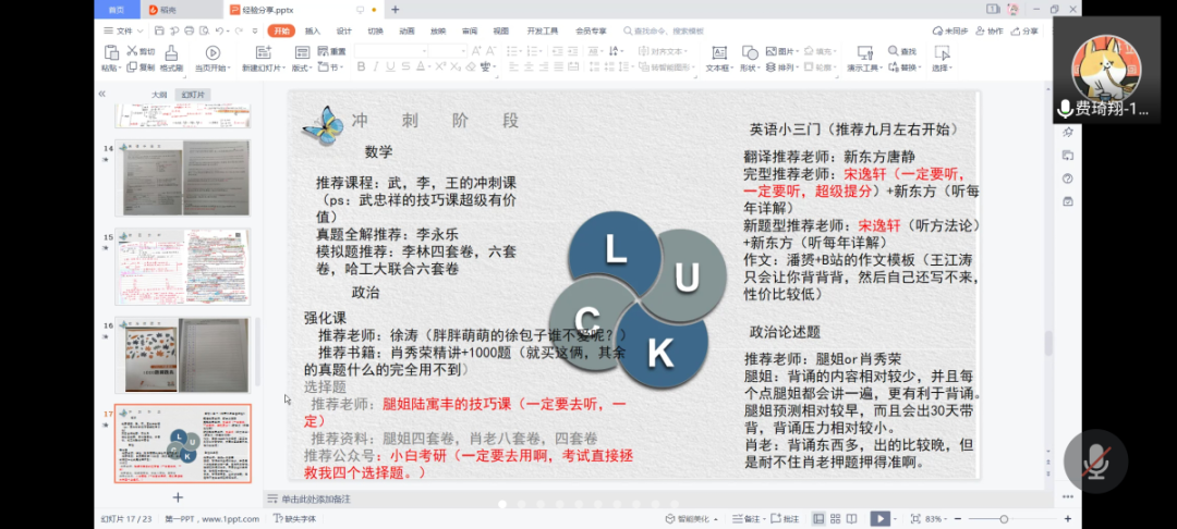 费琦翔则从考研基本情况、个人经验、考研推荐三个方面做了详细的分享。费琦翔表示,准备考研之前,一定要对自己的基础做一个理性客观的评价,预估付出的努力,鼓励大家对比得出适合自己的规划。最后费琦翔为大家推荐了对考研有帮助的微信公众号和APP。