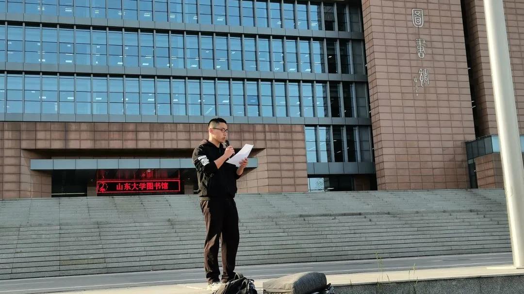 全体团员青年在图书馆门前升旗处整齐列队,等待活动的开始。在团员代表田云汉的组织带领下,团员青年们齐唱国歌并重温了入团誓词。国歌和入团誓词的引领,增强了团员青年们的爱国荣校精神,进而引导团员青年们学党史、强信念、跟党走。