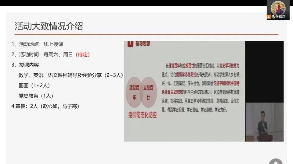 暑期社会实践培训会作出了总结与反馈,主要为同学们重温了外出实践的安全事项与新闻媒体宣传工作所需注意的问题。其次,岳孜烨就本次社会实践所反映出来的问题做了一定的调整,并对之后所需要进行的工作进行了展示。岳孜烨指出,本次社会实践活动需紧跟党史,在注重支教所带来的基础教育之外,还需加强学生的党史学习教育。同时,支教教育也应重视学生的兴趣发展,岳孜烨提出将团队成员的专业优势与支教教育相结合,为学生提供绘画方面的教学,尊重并培养学生的兴趣发展,更加符合支教的意义所在。会议最后,团队成员们开始对实践活动的任务进行了分配,并开始积极投入到实践活动准备工作中。