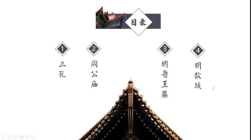 首先,由王轶对自己在曲阜所进行的社会调研进行归纳分享,整理与“古建筑在现代的保护和融入”相关的资料。根据调研情况,王轶选择三孔、周公庙、明鲁王墓、明故城四个古迹进行分享,主要从基本情况、融入方式和保护措施三个方面进行介绍。