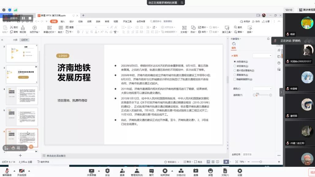 随后,是罗湘明对济南轨道交通的调研。在调研期间,罗湘明实地乘坐济南轨道交通1号线,并对线路、人流量和运行时间等进行记录整理。后期通过网上查阅资料和前往图书馆翻阅往期报刊的形式,初步了解了济南轨道交通的建设和发展历史,并总结了泉水与济南轨道交通建设的关系,还为大家进行解读。最终,罗湘明得出了建设要以人为本,同时也要着重考虑环境因素的结论。