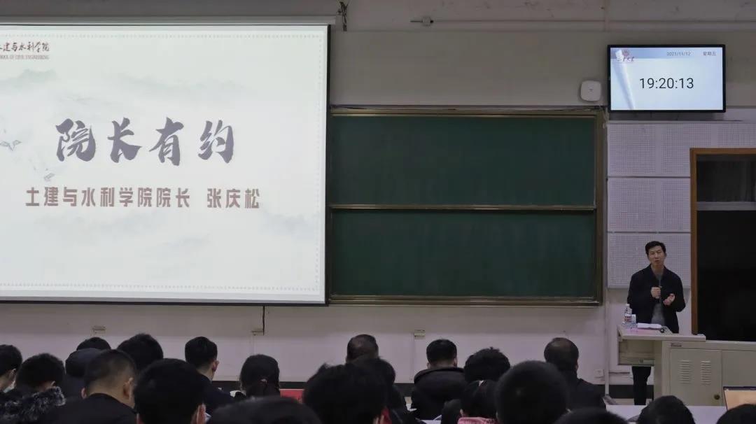 院长张庆松担任主讲人,副院长韩勃,党委副书记张强,2021级土木水利与海洋工程2班班主任刘其方、3班班主任王俊以及各年级辅导员出席,2021级全体同学参加。