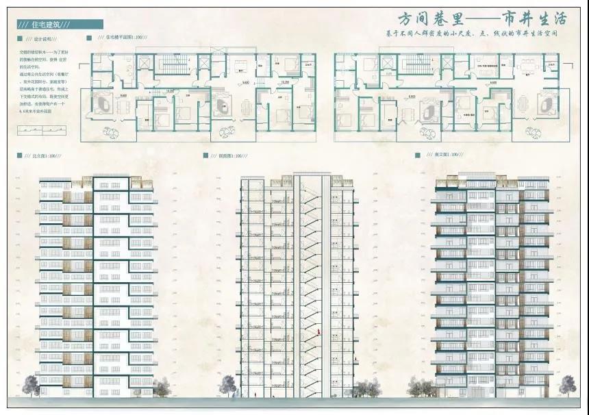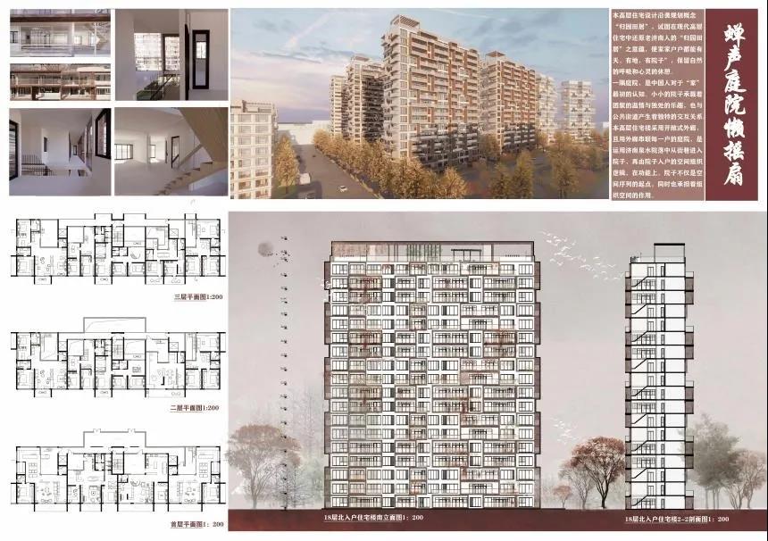 田佳鑫的作品分为住区规划设计和高层住宅楼设计。住区规划设计通过解读老济南容易形成熟人社会的典型空间结构特征,对其进行现代语汇翻译和优化,贯穿在社区规划中,通过营造院落空间与传统“归园田居”生活当中的“商”、“读”、“耕”、“聚”、 “憩”的特色空间,力求保留并加强社区的熟人社会氛围,让居民享受到现代济南的惬意的“田居”生活。