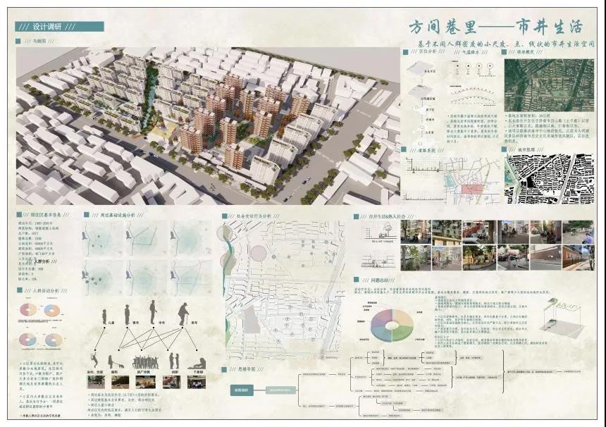 李亚文的作品选取“方间巷里——市井生活"为概念,以老社区原有的生活氛围,延续原有的生活场景作为空间概念的出发点,从空间肌理上是对旧有市井街巷的尺度重塑。