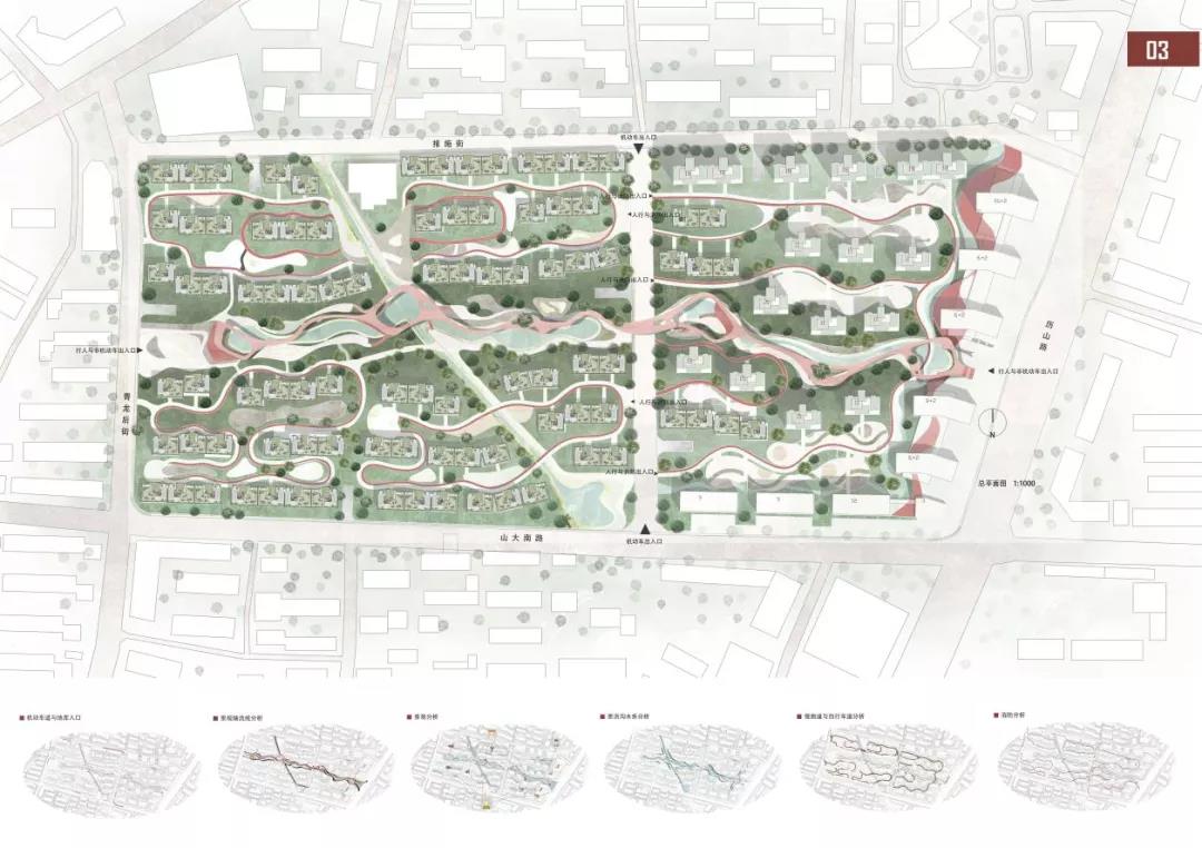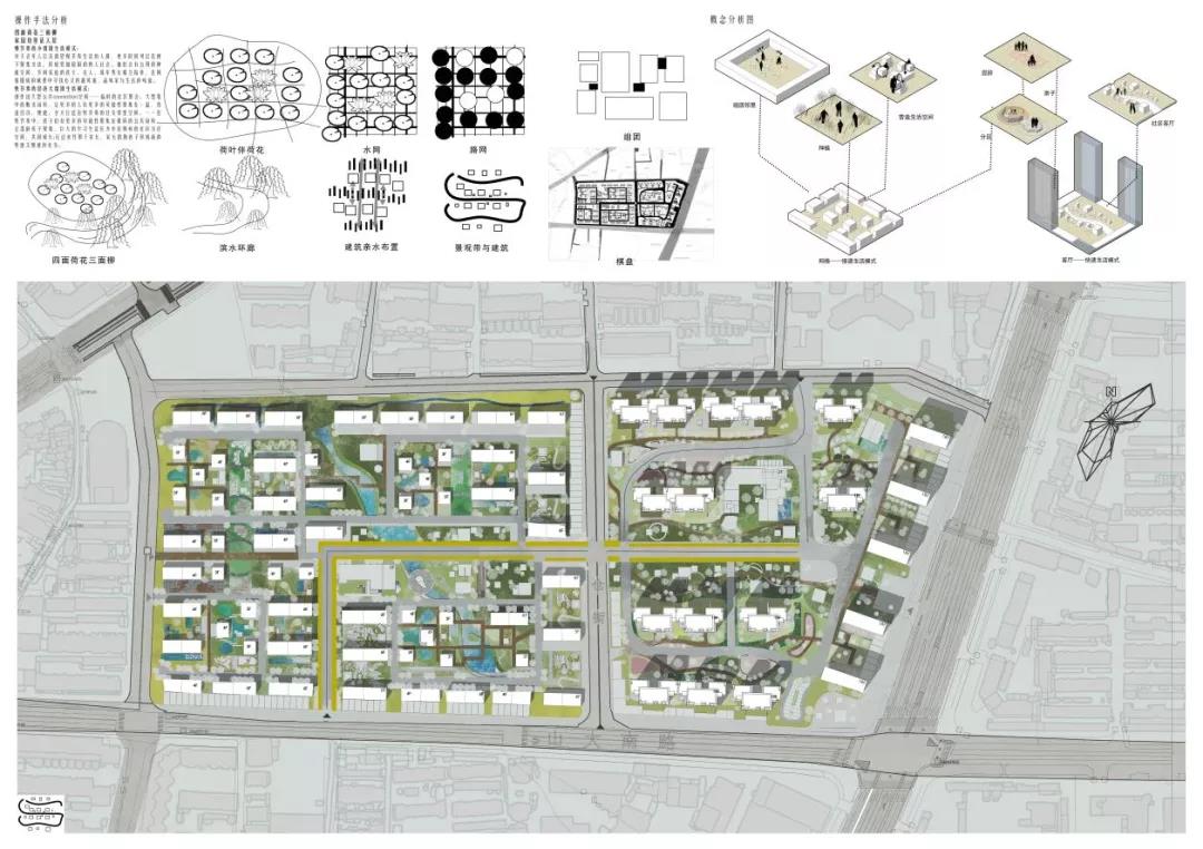 王璨的作品选取“方间巷里——市井生活"为概念,按照老社区原有的生活氛围设计,从空间肌理上来看是对旧有市井街巷的尺度重塑。综合考虑周边建筑、沿街小商业、经济商圈、噪声、人群活动、视野等方面进行设计。将周围居民、生活和行人融入社区,保留老社区原有的生活氛围,在社区内部依托街巷布置不同尺度的活动绿地,形成可容纳市井生活的生活天地。