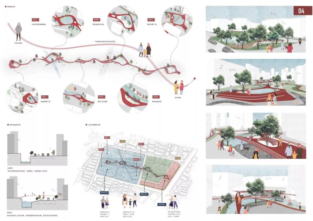 以中间景观轴为媒介,保留了场地原有的泄洪沟水系,将“家家泉水户户柳”与“济南护城河”的意向进行提取和抽象,把泄洪沟的水系延伸进整个场地,拟在场地内打造新泉城风貌。
