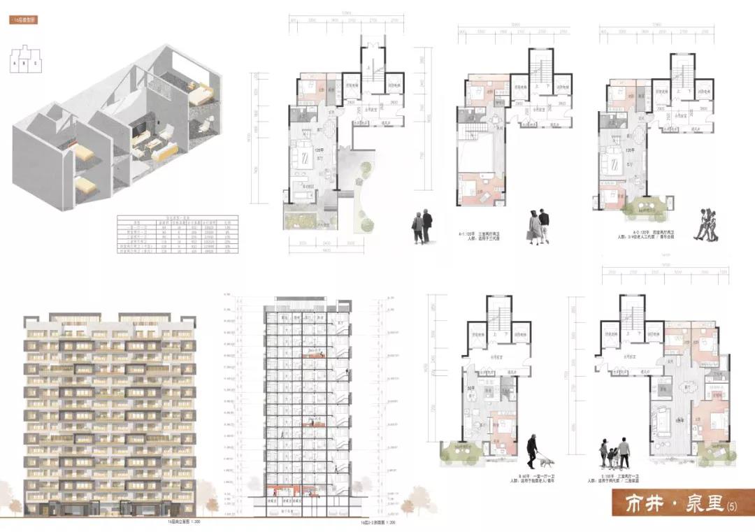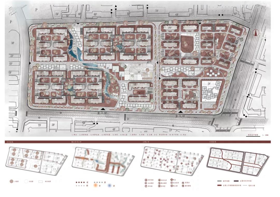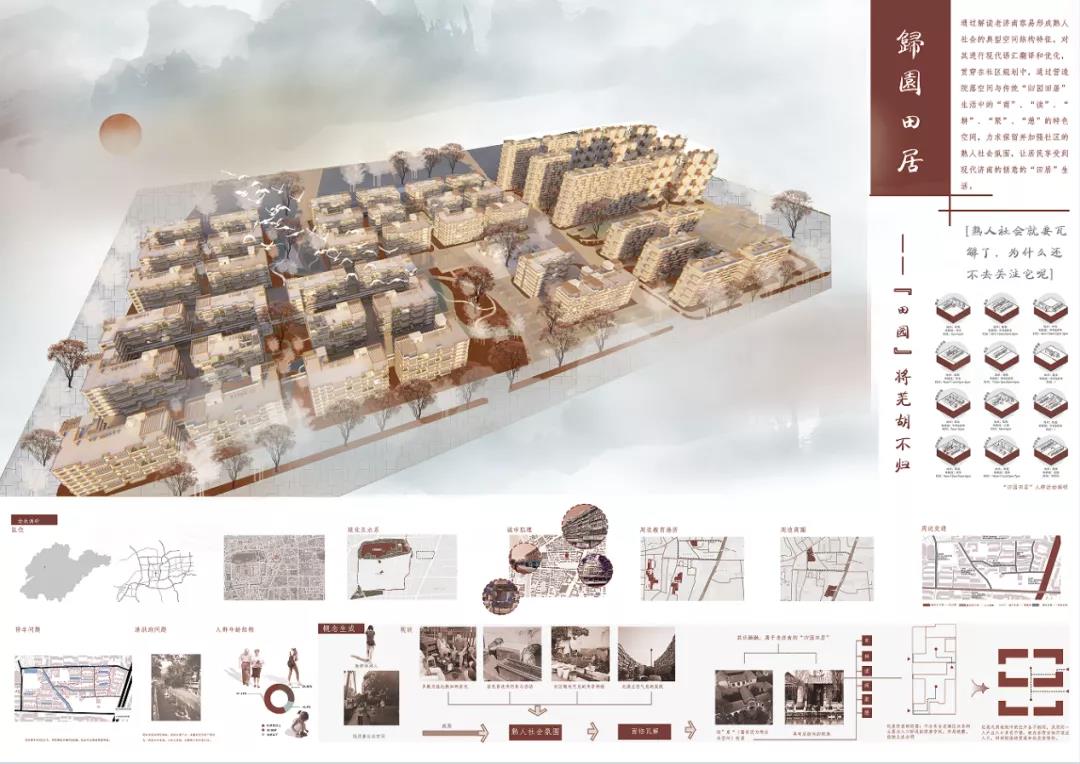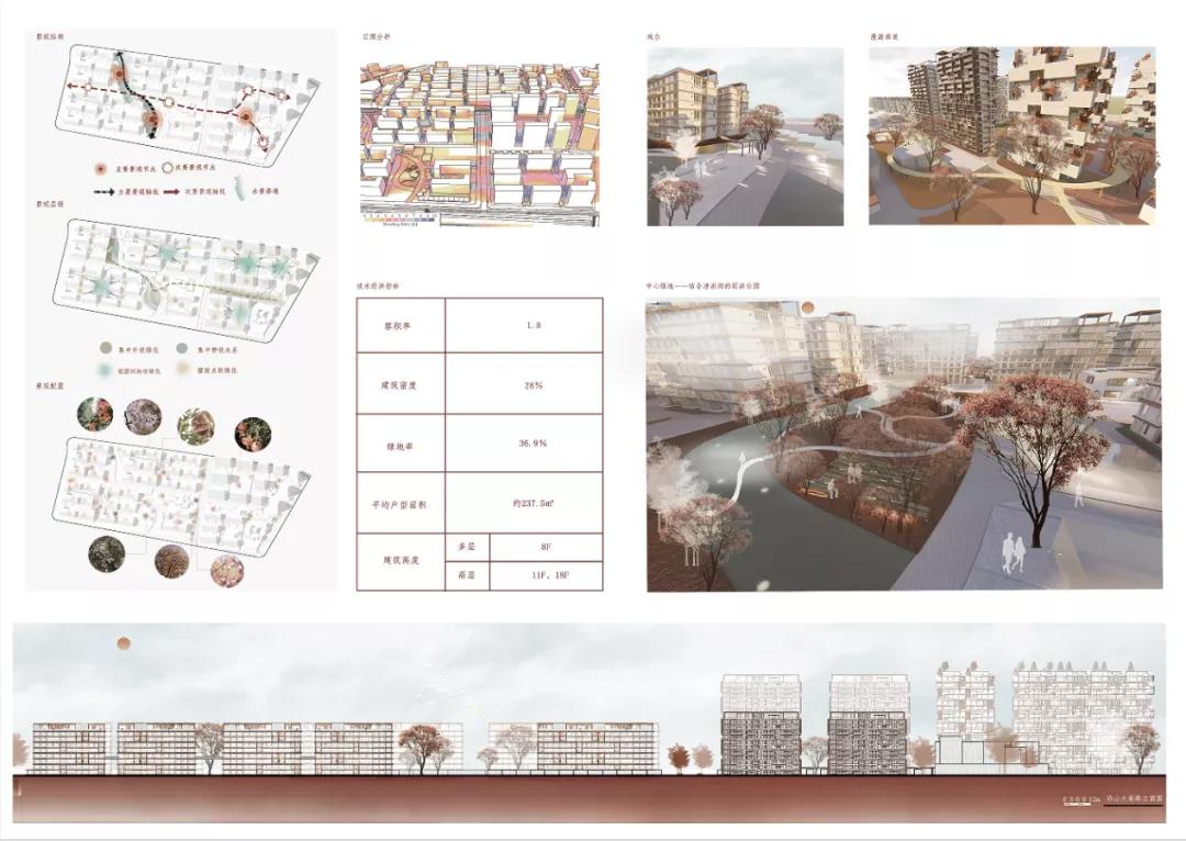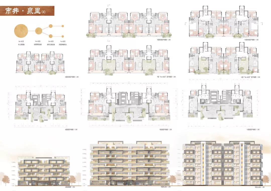 该设计通过引入以曲水亭街为原型的“市井”与“泉水”、功能与环境并置的的空间组织方式,试图形成全龄有效的公共社交活动空间;并分级形成完善的“核心与网点”社交体系,即社区级(5min/中心景观轴+社区商业)、组团级(3min/漫游休憩+便民设施)、单元级(2min/层间共享书屋)、邻里级(1min/邻户共享种植阳台),最终复原老济南“功能有效、年龄并置、自然共生”的传统社交氛围。
