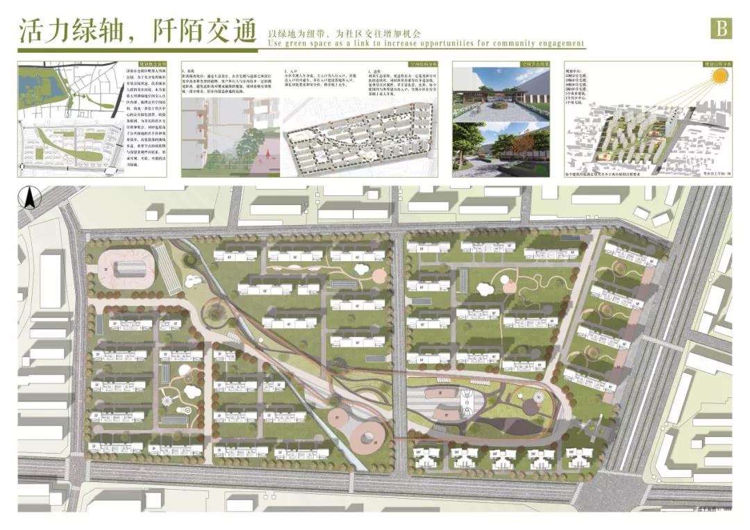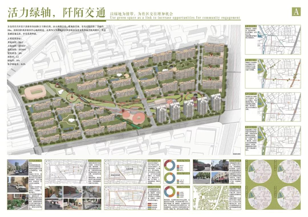 印楠的作品设计的概念是以绿地为纽带,为社区交往增加机会。济南东仓新区毗邻大明湖公园,为了充分发挥城市开放公园用途,改善城市人群的居住环境,本方案将大明湖绿地空间引入住区内部,梳理公共空间结构,构成一条位于社区中心的公共绿色纽带,联接各组团,为居民的社区交往增加机会,同时也提高了公共绿地的共享性和使用效率。
