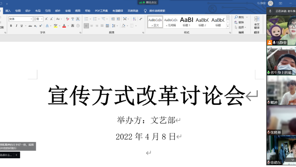文艺部召开宣传方式改革讨论会。会议反思总结了目前宣传方式存在的不足,并从宣传范围、执行效率、效果反馈三个层面重新考虑了宣传方式的改革。
