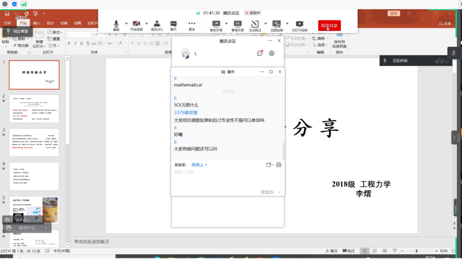 于线上开展大学生创新创业训练项目经验分享会。本次活动由学科部成员张仕龙主持,2018级工程力学系李浩隆、李熠参与分享经验。