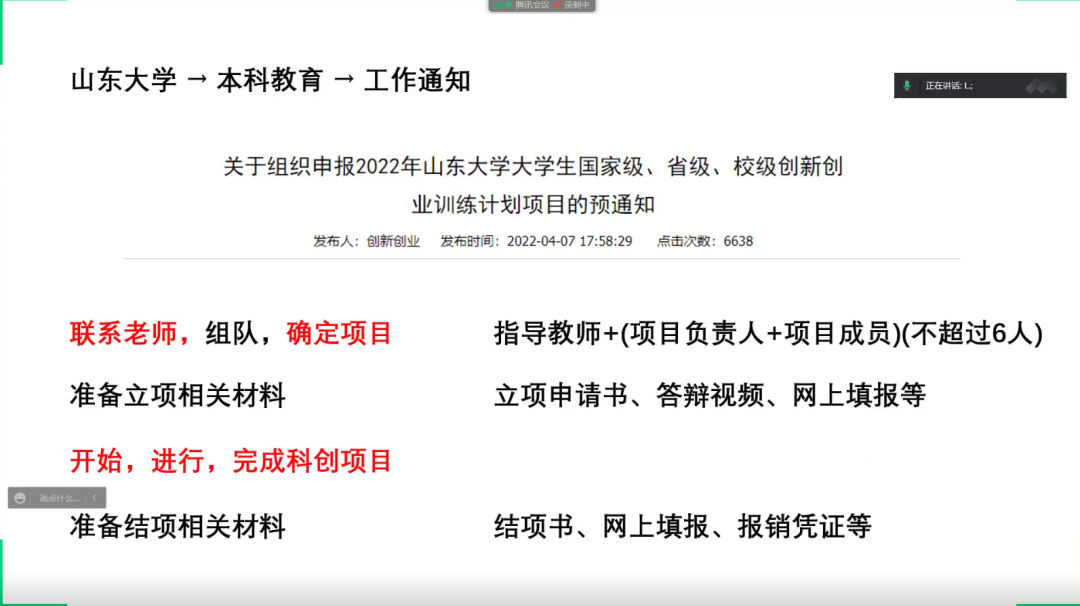 随后,李熠介绍了大学生创新创业训练项目流程和注意事项。他结合自身经验提醒同学们仔细阅读相关文献,不断学习、稳步推进、整理数据、得出结论。在项目推进的过程中会遇到诸多难题,需要提前准备应对措施。