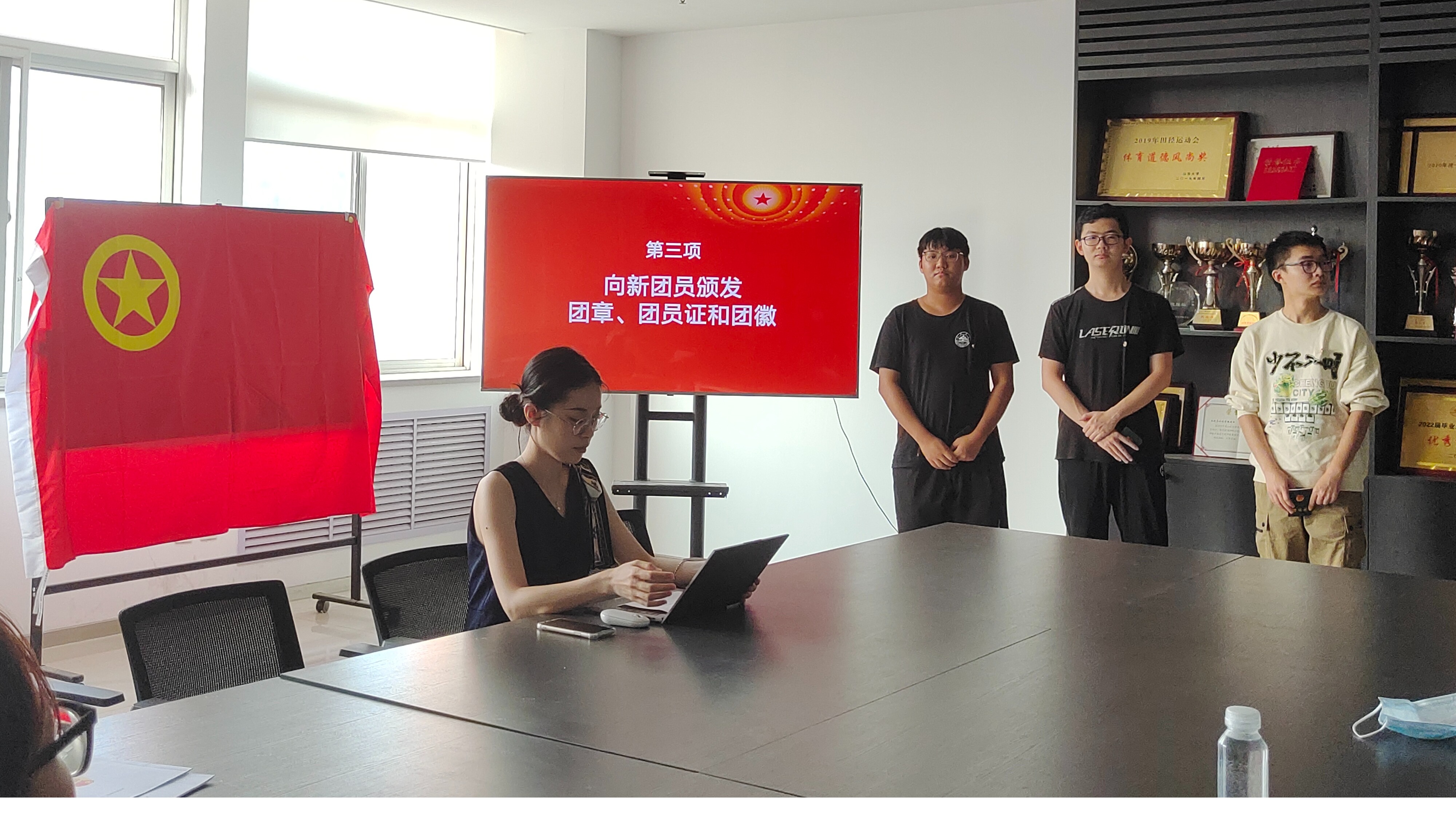 会议伊始,在场人员共唱《中华人民共和国国歌》。接着,何玥对新入团团员表示祝贺,她指出,中国共青团作为党的助手和后备军,是党联系青年的桥梁和纽带,大家要遵守团的章程,认真履行团员义务,听从党的召唤,服从团的领导。她激励新团员要坚定理想信念,规范自身行为,努力提升道德修养,以身作则,成为学习生活中的表率。罗湘明宣布了本次新成员名单,何玥为刘基业、张仕龙、邓长友三位新团员佩戴团徽,颁发团员证。随后,罗湘明带领新团员庄严宣誓。