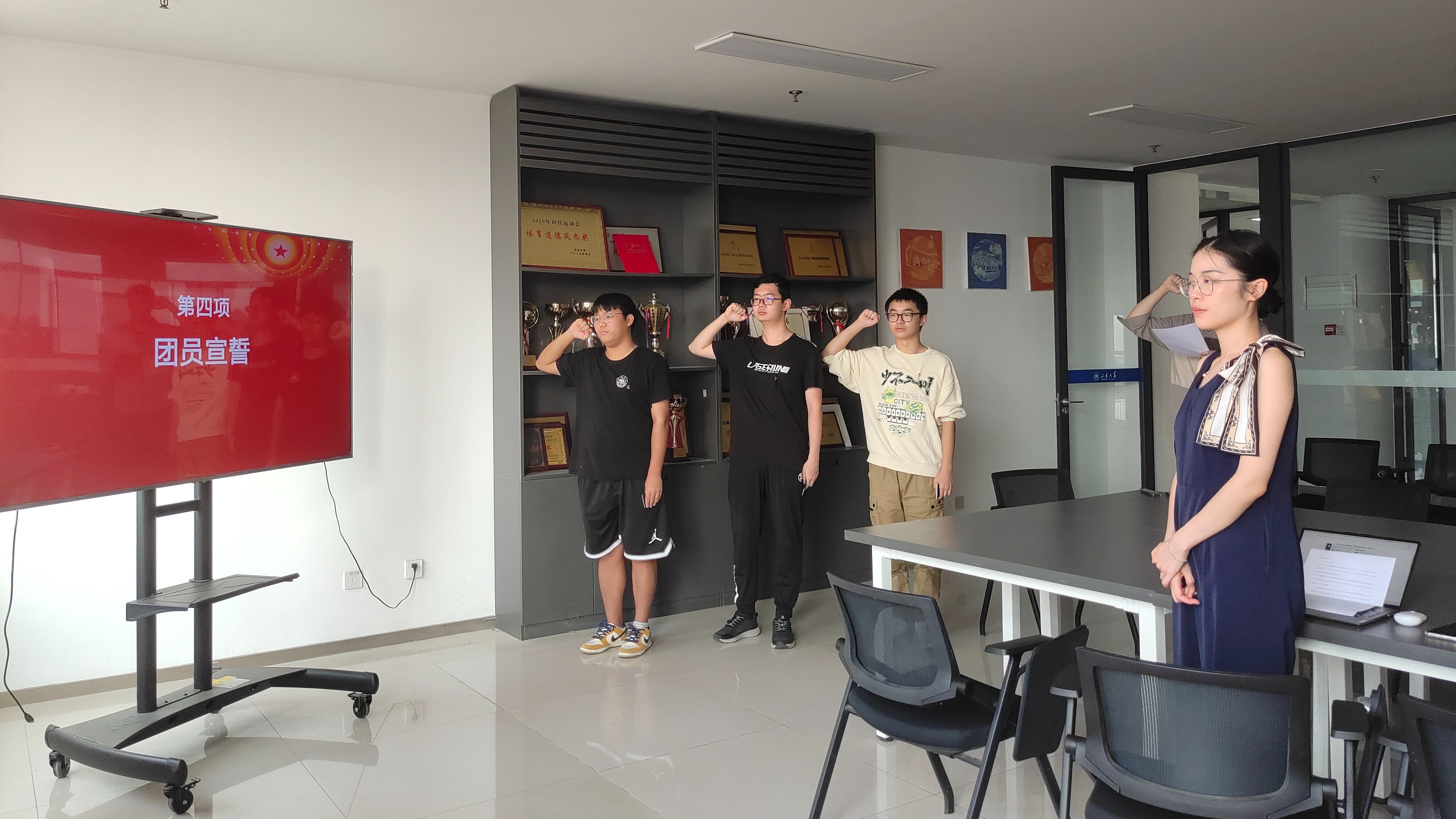 于实验楼633举办集中入团仪式,团委副书记何玥老师出席,学生会副主席单位主席罗湘明主持,新团员及老团员代表参加。