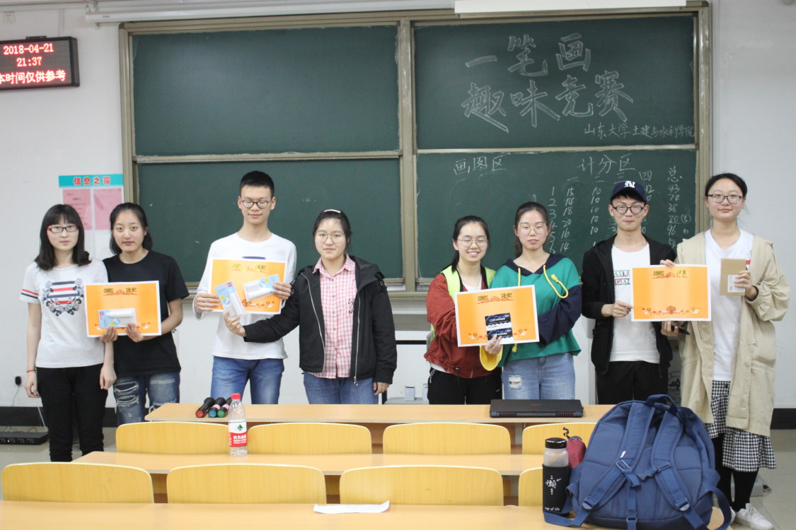 晚6时30分,比赛正式开始。本次比赛分为四个部分:一笔点睛,定点猜图,你画我猜和你比我猜。一笔点睛是让选手观察一幅一笔画,并在擦去大部分线条的图纸上复原原图;而定点猜图是根据处理变形的图片猜测原图内容;你画我猜和你比我猜则分别要求小组一人用画画和肢体语言的方式来描述题目,另一人猜词。在竞赛中,选手们积极参与,享受着每一分每一秒。观众们也乐于其中,欢声笑语充满了整个教室。其中最精彩的部分莫过于你比我猜了。这一环节是抢答题,竞争色彩增强,将比赛气氛推到了高潮。每组的其中一名选手在台下负责努力将主持人提供的随机词第一个发送到竞赛群中来获得答题权,并用肢体语言和表情来描述屏幕所提供的词汇,另一名选手负责在台上背对着屏幕猜词。其中不乏“解忧杂货铺”和“千里迢迢”这样极难表示的题目。台下选手努力将词汇用身体表现,台上的选手绞尽脑汁,在脑海中搜索与队友动作相符的词。有的队伍总是不得要领,笑点十足。当然也有队伍配合神默契,回答迅速而准确,博得了所有人的惊叹和热烈的掌声。经过激烈而欢快的比拼,最终,韩晶晶和李福霜荣获一等奖,于博翔和谢志鑫荣获二等奖,马瑞峰等六人荣获三等奖。