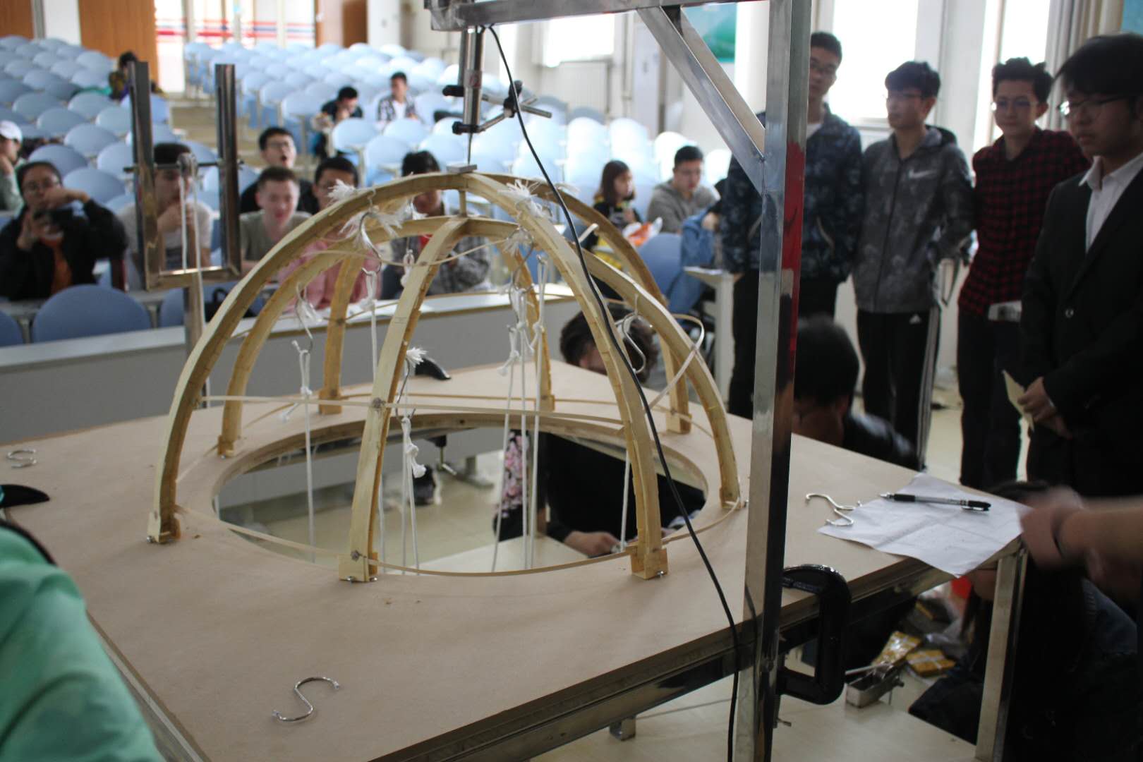 4月1日,第十二届全国大学生结构设计竞赛bilibili 选拔赛于兴隆山校区讲学堂101举行。bilibili 土木工程系邱灿星博士作为评委出席本次活动。 本次选拔赛共有73支队伍参赛,成功完成对模型的全部加载测试方可胜出。赛前,各队已经领取底板和模型进行粘连并称量模型净重。加载测试过程分为三个阶段:第一阶段为竖向静载加载,第二阶段在第一级的荷载基础上,抽签选取四个加载点进行竖向随机加载,第三阶段在前两级荷载基础上,抽签选出一个加载点施加水平荷载。经过层层筛选,最终功夫竹子队等六支队伍所制作的模型脱颖而出,将参加下一轮选拔。(文、图/苏京轩 梁莹)