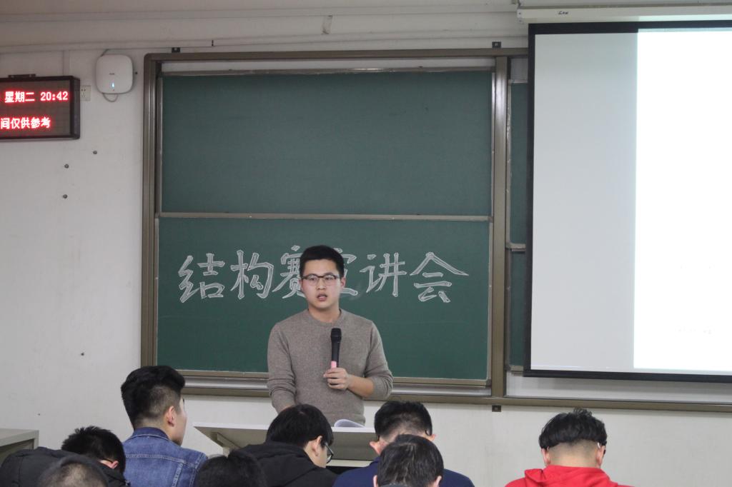 大会伊始,赵鑫首先向同学们展示了结构设计竞赛的整体概况。同学们热情高涨,偌大的会场座无虚席。在完成对结构赛的概念性描述之后,作为高年级的学生,赵鑫以其独到的视角由表及里,深入浅出地为大家阐明了比赛流程,赛事要求,注意事项及赛前准备等内容。本次结构赛分为校赛,省赛和国赛。需要以竹皮,竹条为原材料,制作一个大跨度的屋盖结构模型。模型需要在三个级别的加载中保持结构的稳定。翔实的文字资料,形象的讲解与介绍,使在场的同学们大开眼界,多角度地认知了结构设计大赛的方方面面。在完成对赛事的分析与讲解后,同学们踊跃发言提问。赵鑫围绕加载方式,结构连接方式,材料性能等方面为大家解答了参赛的疑惑。会场气氛活跃,彰显了山大学子对知识的热爱和对创新的追崇。