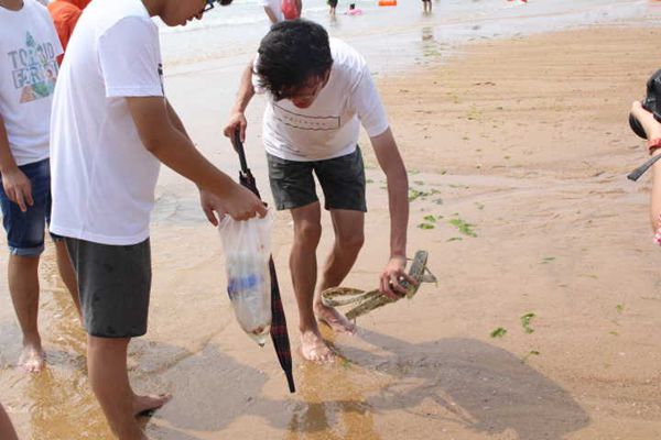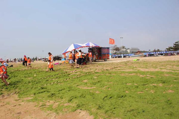 整个调研活动持续2个小时。在调研活动期间,队员们沿海岸线不断前进,对海岸垃圾进行捡拾、收集、取样,并且和当地环卫工人进行深入交谈。在交谈过程中,队员们发现浒苔问题仍然是当地海滩环境保护的重大问题,大量繁殖的浒苔能遮蔽阳光,影响海底藻类的生长,还会严重影响景观,干扰旅游观光和水上运动的进行,所以也是也是环卫工人工作的主要负担。据环卫工人所说,第三海水浴场的发展已经持续了20年。在这20年内,随着日照旅游对外宣传力度的加大,夏季来该浴场洗海澡、度假的人越来越多。但是大量游客到来的同时也加重了海边的污染问题,生活垃圾的不断产生成为海岸及海水污染的主要原因。近年来,政府及管理部门已经加大了对海边环保的宣传力度,环境问题 得到了一定的改善。
