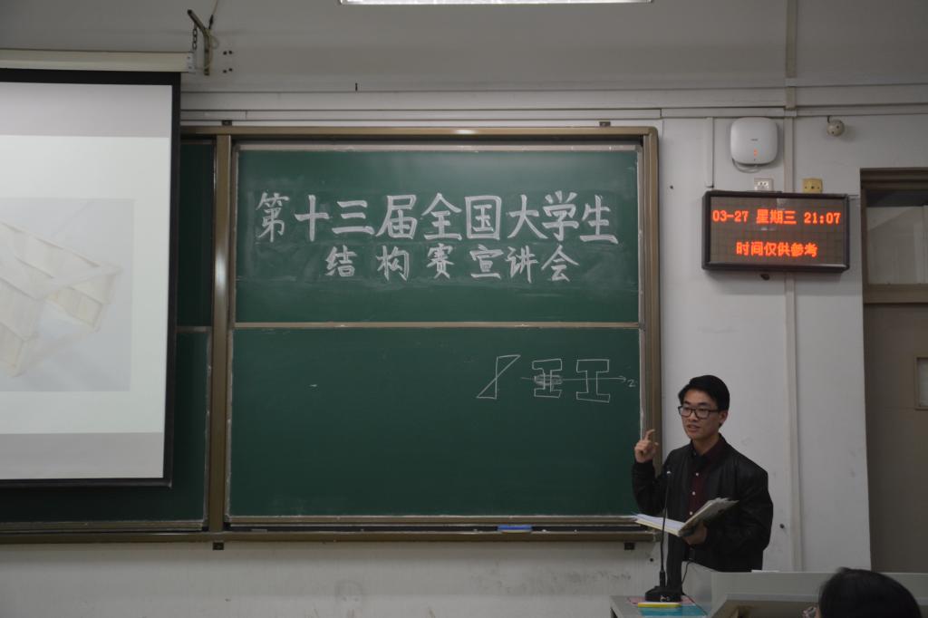 于兴隆山校区教学群楼举办了第十三届全国结构设计竞赛宣讲会。活动邀请了参加过往届结构赛的优秀学生代表刘胜琪、魏玮作为主讲嘉宾,为同学们分享备赛经验。