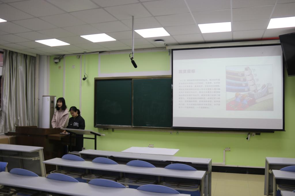 会议伊始,主讲人李梦筱和魏玮从农村人大代表参加两会的发言及回到乡村后向村民传达两会关于脱贫攻坚指示精神的视频切入主题,说明了脱贫攻坚对当下中国建设的重要性与急迫性,体现出我国正在为脱贫攻坚做出的努力。李梦筱向与会同学详细介绍了脱贫攻坚的含义、目标、原则及其时代特征,其中着重强调了精准扶贫思想的形成过程,并对我国召开的关于脱贫攻坚的会议的作用进行了具体分析。魏玮则主要从生产生活、基础设施以及深度贫困地区的特殊情况等方面出发,阐释了如何才打赢脱贫攻坚战,并给出了国家正在实行的一系列举措。两位主讲人还通过展示湖南湘西十八洞村、陕西延川梁家河、河南兰考等五处脱贫成功实例的相关资料点明了我国在脱贫攻坚领域取得的成就与经验,从而使在座同学对脱贫攻坚有着更深入和实际的理解。