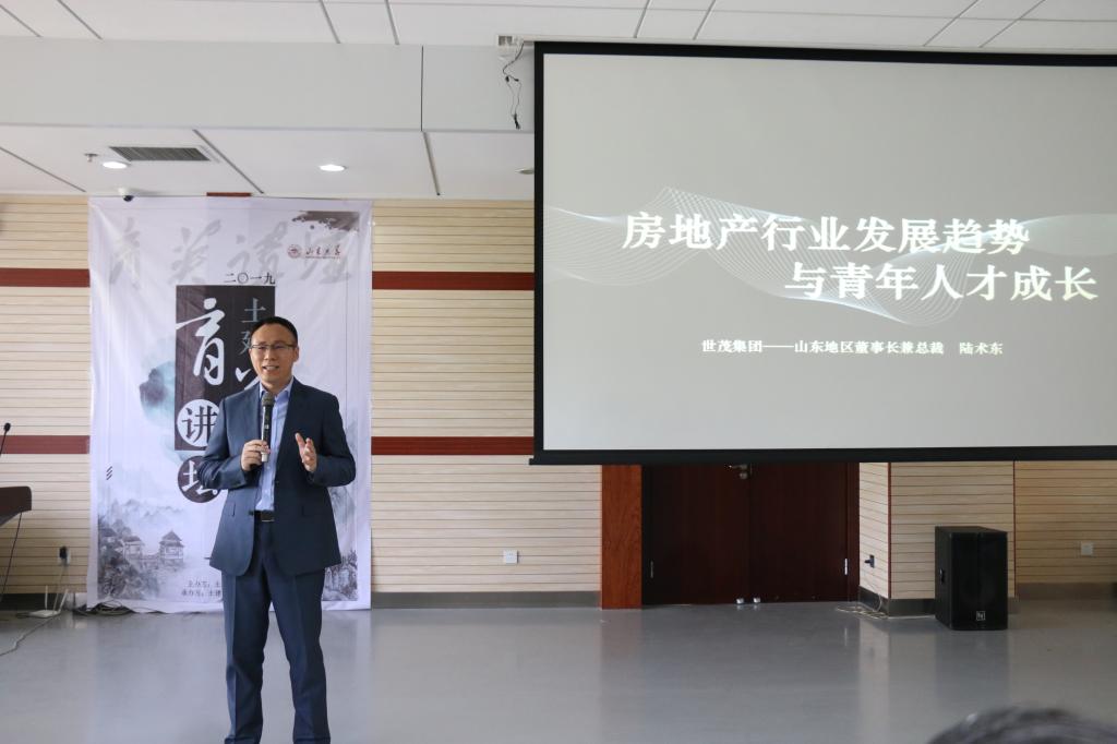 于兴隆山校区图书馆报告厅举办了第一期育英讲坛。世茂集团山东地区公司董事长兼总裁陆术东应邀做题为“地产行业发展趋势与大学生发展规划”的讲座。世茂集团山东地区公司人力行政负责人、助理总监孙毅,组织人才发展招聘培训负责人、高级经理刘乐英,bilibili、校园招聘负责人王珺,董事长助理刘晓满,bilibili