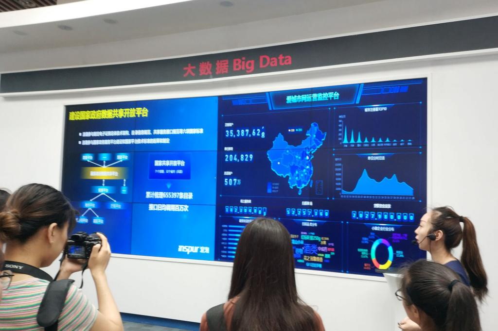 12时30分许,调研团成员在浪潮科技园西门集合,随后在工作人员的带领下,进入浪潮集团展示大厅参观。工作人员结合历史照片与产品实物详细讲解了浪潮集团的发展历史、重大成就以及产品的更替,随后又结合视频与实时数据,为团队成员介绍了大数据及云计算在农业、交通、医疗、政务方面的应用,以实际的例子展现了大数据与云计算技术为日常生活带来的巨大便利,并展示了浪潮集团在将这两项技术与生产生活的结合方面取得的成就。