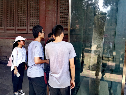 来到曲阜孔庙,实践队员前依次游览了棂星门、圣时门、弘道门、大中门、同文门、奎文阁、十三御碑亭。从大中门起,队员们三路游览:中路参观了成门、大成殿、寝殿、圣迹殿及两庑,;东路参观了崇圣门、诗礼堂、故井、鲁壁、崇圣词、家庙等地方;西路则为启圣门、金丝堂、启圣王殿、寝殿等建筑。