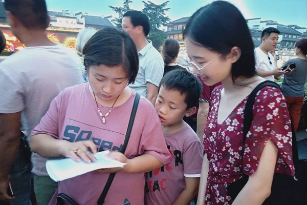 6时30分许,调查团全体成员在秦淮河畔文德桥处集合后开始了第一次实地调研活动,成员们采取了问卷调查和采访的形式了解市民对于秦淮河水资源的认识和了解。调研团六位成员分为了三个小组,对当晚在文德桥附近活动的市民以年龄梯度和性别分类分别进行了问卷调查。