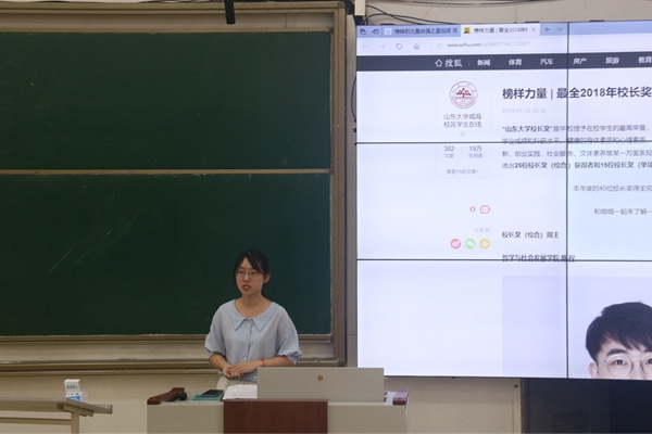 年级大会主要从辅导员自我介绍、建议分享、学生上台分享收获计划、“榜样的力量”优秀学生风采学习等方面进行。会议之初,李新迎进行自我介绍,并提出正值新中国成立七十周年,希望全体学生向着德智体美劳全面发展的社会主义建设者和接班人的目标迈进,把实现山大梦、山东梦、中国梦落实到每一位学生身上。李新迎表示,大二是一个重要的过渡与夯实基础的过程,希望全体同学秉持初心、继续努力,并分享了三条建议:一是热爱生活,懂得感恩,严于律己,宽以待人;二是稳扎稳打,永远以学习为重;三是全面发展,积蓄力量,积极参加科研、志愿服务、学生工作等。李新迎鼓励全体同学去积极尝试,找到自己的兴趣所在。接着,李新迎请史泽华、史博、赵元硕等8位同学上台分享了大一的收获与大二的计划。最后,李新迎详细讲解了校长奖学金的申报要求,全体学生观看了“自强之星”视频《寻找启明星》。这些优秀个人或团体各有所长,期待学生们从他们的故事中学习到新时代好榜样应当具备的品质,并有所思考、有所改变,成为更加优秀的自己。