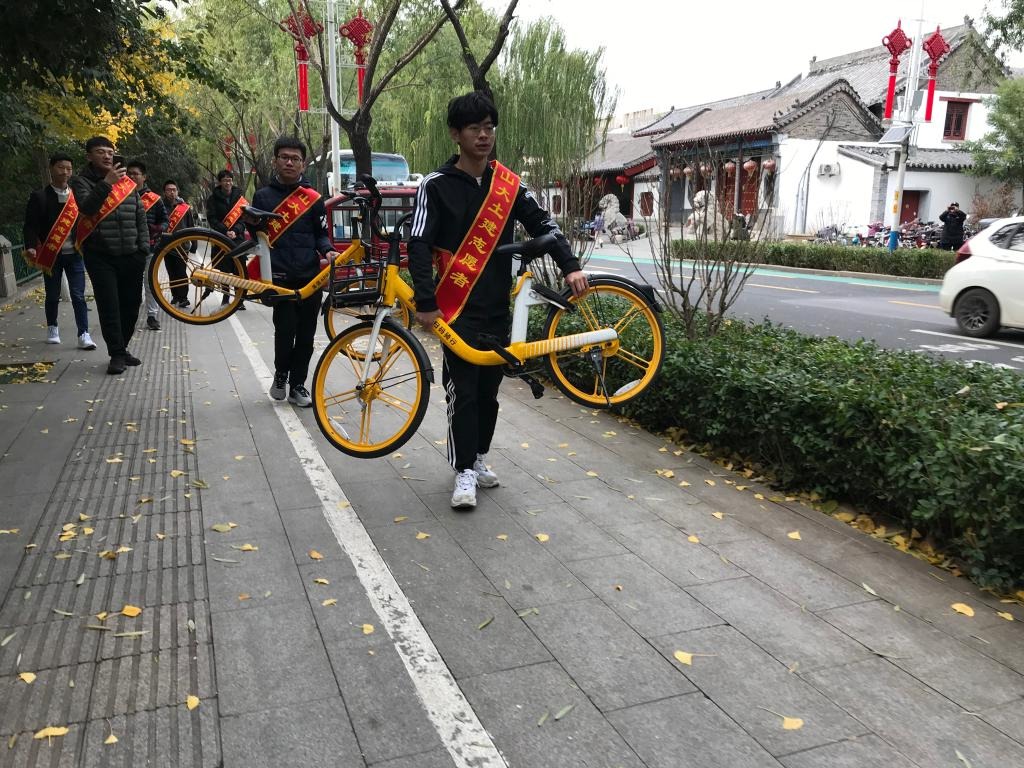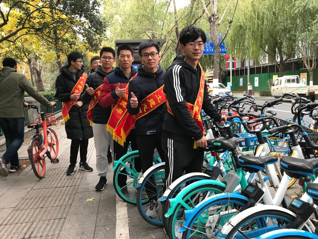 随后,志愿者们来到解放阁进行共享单车的整理工作。活动过程中,志愿者们积极认真工作,一起将不在正确位置的共享单车搬运到指定位置,对于损毁的自行车及时上报。期间,张秀华陪伴在志愿者们左右并给予经验指导。经过两个多小时的努力付出,志愿者们提前完成了此次志愿服务的工作。活动结束后,志愿者们与张秀华在解放阁前合影留念。
