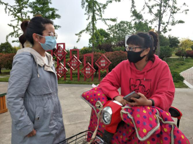通过调查对公园周边居民的现在生活、心理状况有了初步了解之后,王璨对公园内的游客就外出活动以及复工复产时应注意的细节防护知识进行了简单交流,并通过发放宣传单的形式对居民进行系统防控知识的普及。通过轻松的聊天等方式,一边交谈,一边了解现状、进行防疫知识的普及,缓解人们的忧虑。