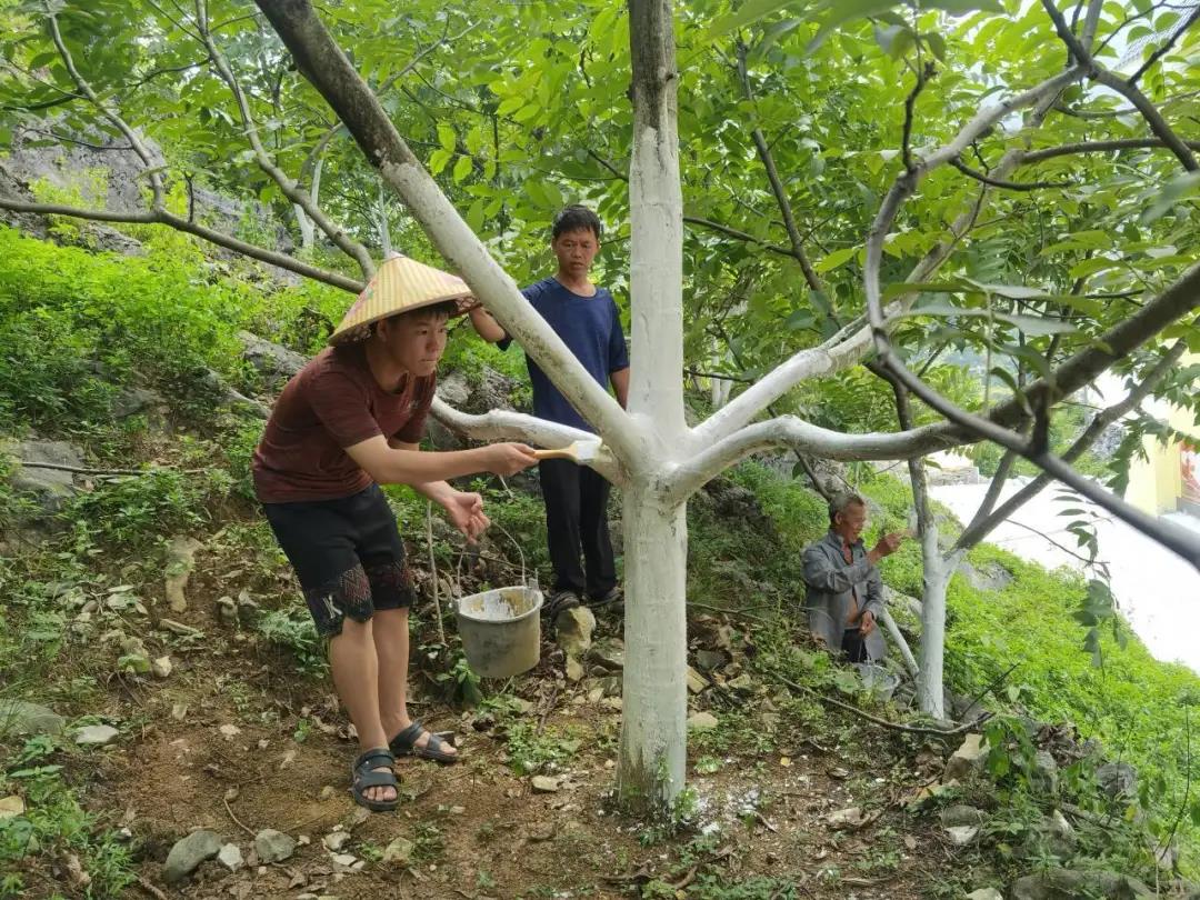 上午八点,队员们在安兰村护林员队长袁家敏的带领下参观了安兰村核桃示范片,安兰村核桃树现有成活12191株,广泛分布于全村25个队,其中示范片位于龙汉队和力米队。袁家敏给队员们介绍了核桃树种植培育的注意事项与核桃产业情况。目前安兰村核桃树种植处于发展阶段,核桃树种植数目多但结果数量较少,需要护林员和农户投入更多的精力去修护培养,尚未能给农户带来稳定的经济效应。核桃树需要农户定期进行修剪、施肥,还要在季节变化时给核桃树涂白,防治天蛾虫、天牛虫、蛀虫等害虫影响。袁庭蔚参与到了核桃树的修剪,施肥与涂白工作中,并运用所学的边坡工程知识维修稳固核桃林田土,减少暴雨山间的水土流失。实践团队参与完成了十亩120株核桃树的修剪与涂白工作,队员在实际的劳动中体会护林员与农户的工作,在劳动锻炼中促进了个人的发展。