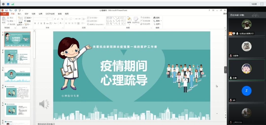 “青春有我,共同抗疫”社会实践团队举办了关于疫情期间心理疏导的讲座。参加讲座的人员有江苏省苏州市高新区科技城社区、安徽省巢湖市南苑社区、浙江省温州市乐成街道、江苏省泰兴市济川社区、西安逸翠园社区居民,以及本学院部分同学。本次讲座由队员金翊洁主讲,队长印楠主持。