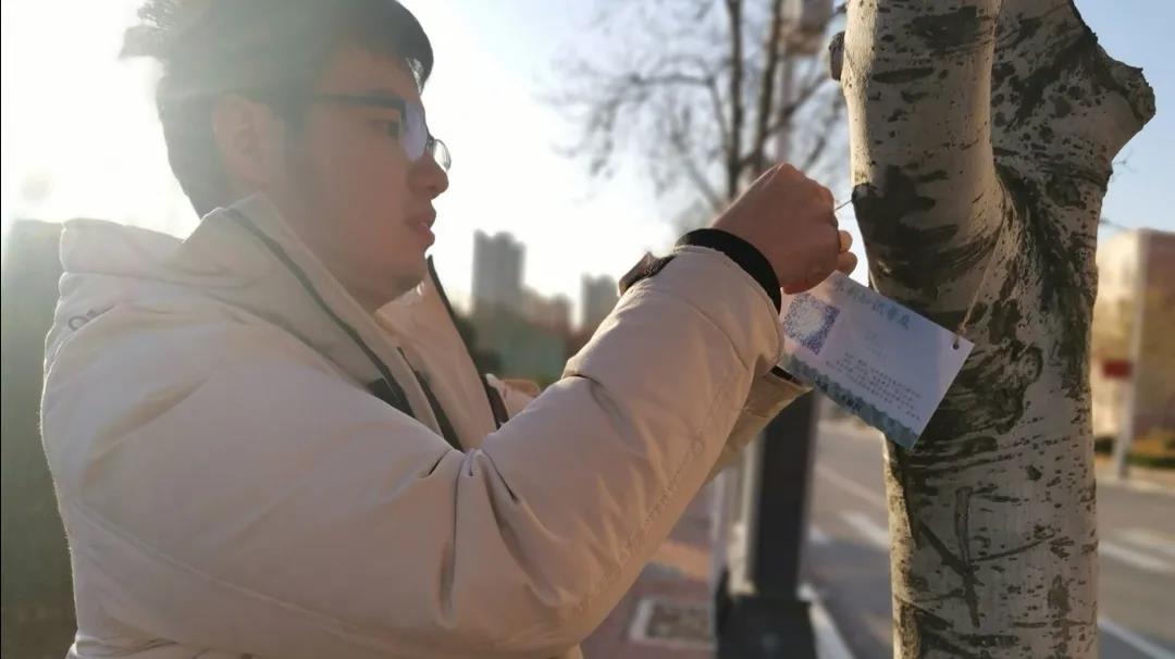清扫落叶工作结束之后,同学们开始在校区各个地方的树上悬挂自制的树牌。树牌以“水利知识普及”为主题,有两种不同样式,上面附有二维码,来往同学可以通过扫码看到由2019级水利系同学整理编辑的三个类别共九篇有关水利知识的文章。树牌分布在白玉兰路、校车站点、实验楼、快递中心、欣园餐厅西广场等多地,为同学们提供长期的知识普及。