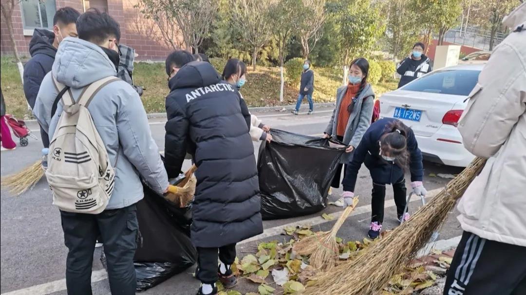 同学们于下午两点准时在实验楼门口集合,在相关负责人的带领下领取工具并到指定区域进行清扫,此次落叶清扫活动划分的区域为兴隆山校区西门出口处的大道。每个人分别分到了用大扫帚将落叶集中、用小扫帚进行局部清扫、用垃圾袋进行落叶收集等工作,同学们之间分工协作,清扫工作进行得有条不紊。