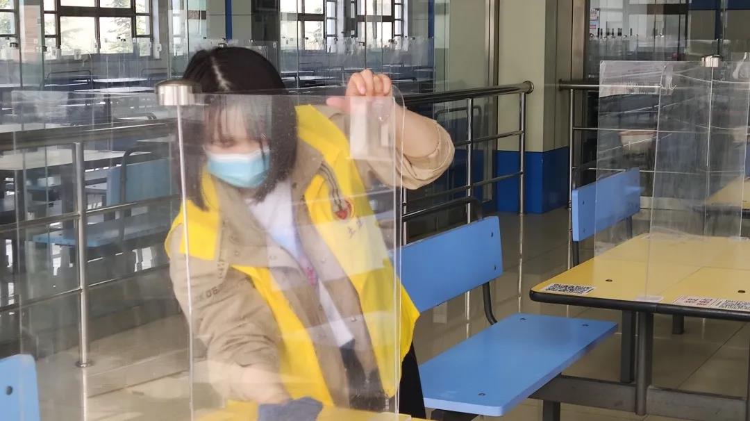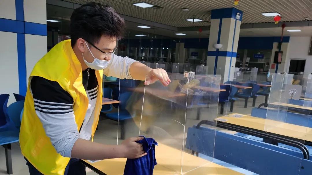在本次活动中,各组同学根据食堂工作人员安排,分别对欣园餐厅、悦园餐厅各楼层的楼梯间、窗台、桌椅与透明隔板进行擦拭清扫。在清扫的过程中,土水海三班全体同学始终保持细心耐心的志愿精神,无论是食堂桌椅边缘堆积许久的油污,还是不断晃动的玻璃挡板上的水印和污渍,都被同学们细心清理,不放过一边一角。经过同学们两天的清扫,食堂的各个角落都变得更加洁净,放眼望去变得干净透亮的隔板与触碰时不再充满油渍的桌椅边缘使土水海三班的同学们充满了成就感,同时,干净的食堂也为同学们提供了更良好的用餐环境。