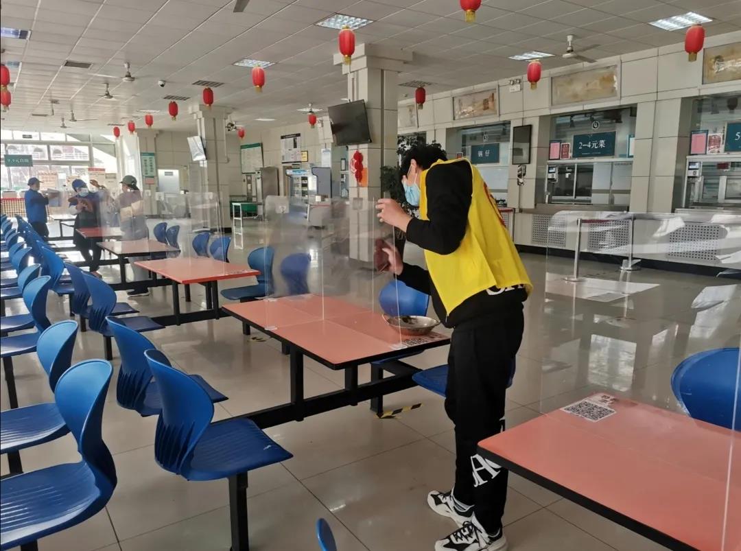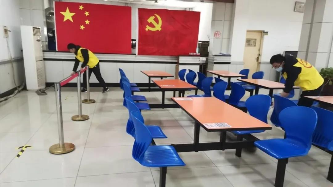 各组同学提前到达餐厅领取服装,集队完毕后根据食堂工作人员的安排进行清扫活动。活动内容包括拖地、清洁桌面、擦拭透明挡板。地上滴落的汤水被擦去,桌上残余的细小垃圾被清理,挡板上喷溅上的油污被抹去,同学们分工协作、认真细致,清扫活动进行得有条不紊。