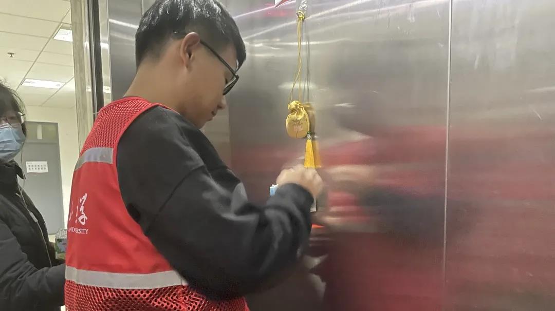 在与物业管理人员联系沟通后,同学们将前期准备好的棉签盒安放在兴隆山教学楼的三个电梯内。同学们首先考察了电梯的内部空间,选择合适位置放置棉签盒,并放入了棉签。棉签盒的安装选取了合适的高度以及美观的间隔空间,使安装方式实现了适用性和艺术性的统一。