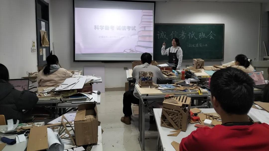12月17日下午6时, 2021级建筑系二班于兴隆山校区实验楼524教室开展诚信考试主题班会。班长许阳主持,班主任赵亚琛出席,建筑系二班全体同学参加。许阳向同学们详细解释了考试守则的具体内容,强调了诚信考试的重要性。班主任赵亚琛提醒同学们考前调整心态,注意饮食;考后适度放松,合理规划时间。通过本次班会,同学们加强了诚信考试的意识,将以良好的精神状态面对接下来的考试。