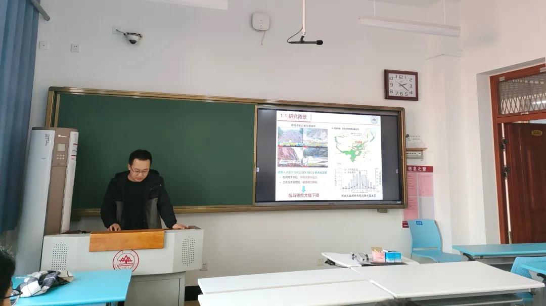 高旭光、谭怡然、刘太衡、沙俊锋、马永健的研究课题涉及生态岩土工程、非饱和土力学及微观岩土力学方向,齐萌的研究课题涉及土遗址与砖石质文物保护方向,他们从研究背景、研究内容以及应用与展望三个方面对大家进行了详细的课题介绍。交流环节,同学们与王老师和课题组成员进行了热烈交流讨论。此次报告会搭建了研究生与本科生之间沟通桥梁,开拓了同学们的视野,使大家能够直观了解研究生的学习工作现状,进一步激发了同学们参与科研项目的兴趣。