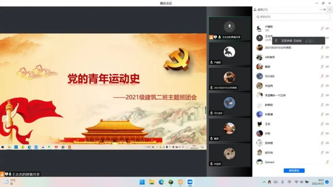 近日,2021级建筑系二班于线上召开本学期第一次主题团会,团支书王志杰主持,全体同学参加。团会以学习党的青年运动史为主题,进行深刻的分析与反思,有助于同学们对党有更为深刻的认识,激发新时代中国青年应有的责任与担当,增强了同学们对党和国家的认同与拥护。