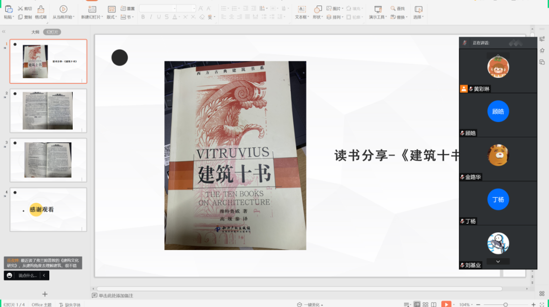 为迎接“世界图书与版权日”,培养学生读书好学的品质,4月23日,2020级建筑学系于线上举办读书分享会,黄彩琳主持,2020级建筑学系全体同学参与。会议中,同学们分享了近期所阅读的书籍,包括《建筑十书》等。会议上同学们积极发言,表达看法,在建筑学系掀起了读书的热潮。
