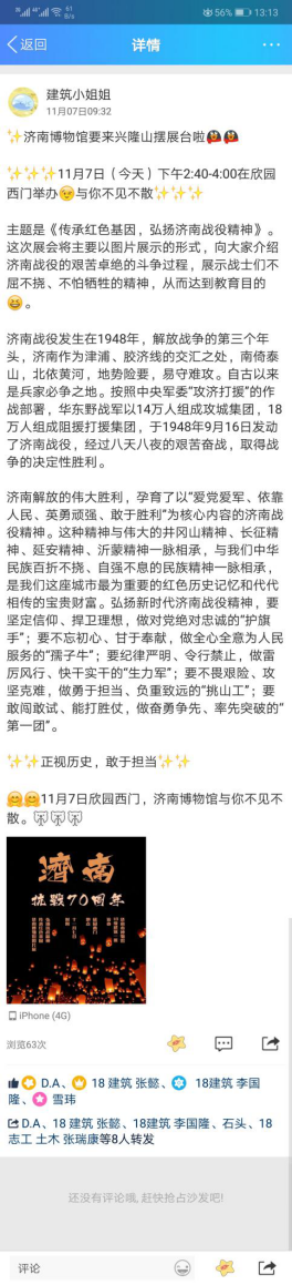 活动简介:博物馆不仅是展示我国优秀文化的场所,也是当代大学生学习知识,培养情操的第二课堂。由此,我们班级借着本次手拉手志愿服务大赛的机会,联系到了济南市博物馆的工作人员,开展了“博物馆进校园”之济南战役历史图片展,带领大家体会图片背后的济南战役革命精神,使大家可以在校园内拓展历史知识,缅怀先烈。11月3号,班内同学前往济南市博物馆开展实地志愿活动。11月7号,协助博物馆工作人员在校内举办展览。
