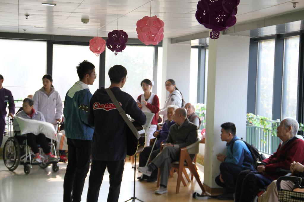 随后,同学们按照分工开展相应的志愿活动,为每个房间的老人送出新鲜水果和亲手制作的纸花球、小天鹅,并与老人聊天、了解他们的生活,与老人一起唱红歌……一个个暖心的活动,既传达了同学们的志愿热情,又传递了同学们对老人的关心与祝福。随后,大家现场表演了精心排练的节目,吉他、新疆舞、合唱等节目都获得了阵阵掌声。在场的老人观看同学们的表演,与同学们聊天,度过了一段美好的时光。