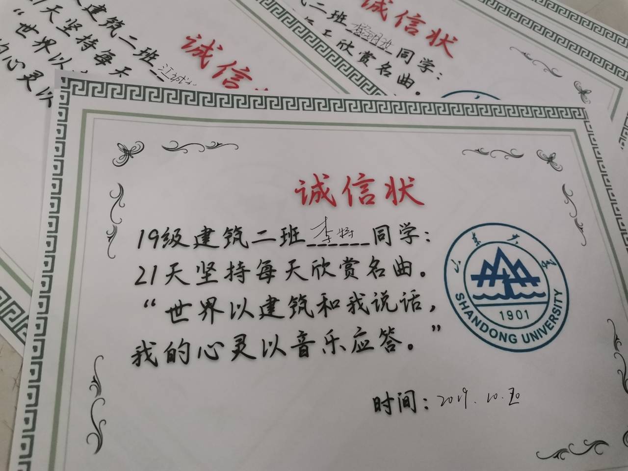 2019级建筑二班全班19名同学共同签署了“每天欣赏一首名曲”21天诚信状。