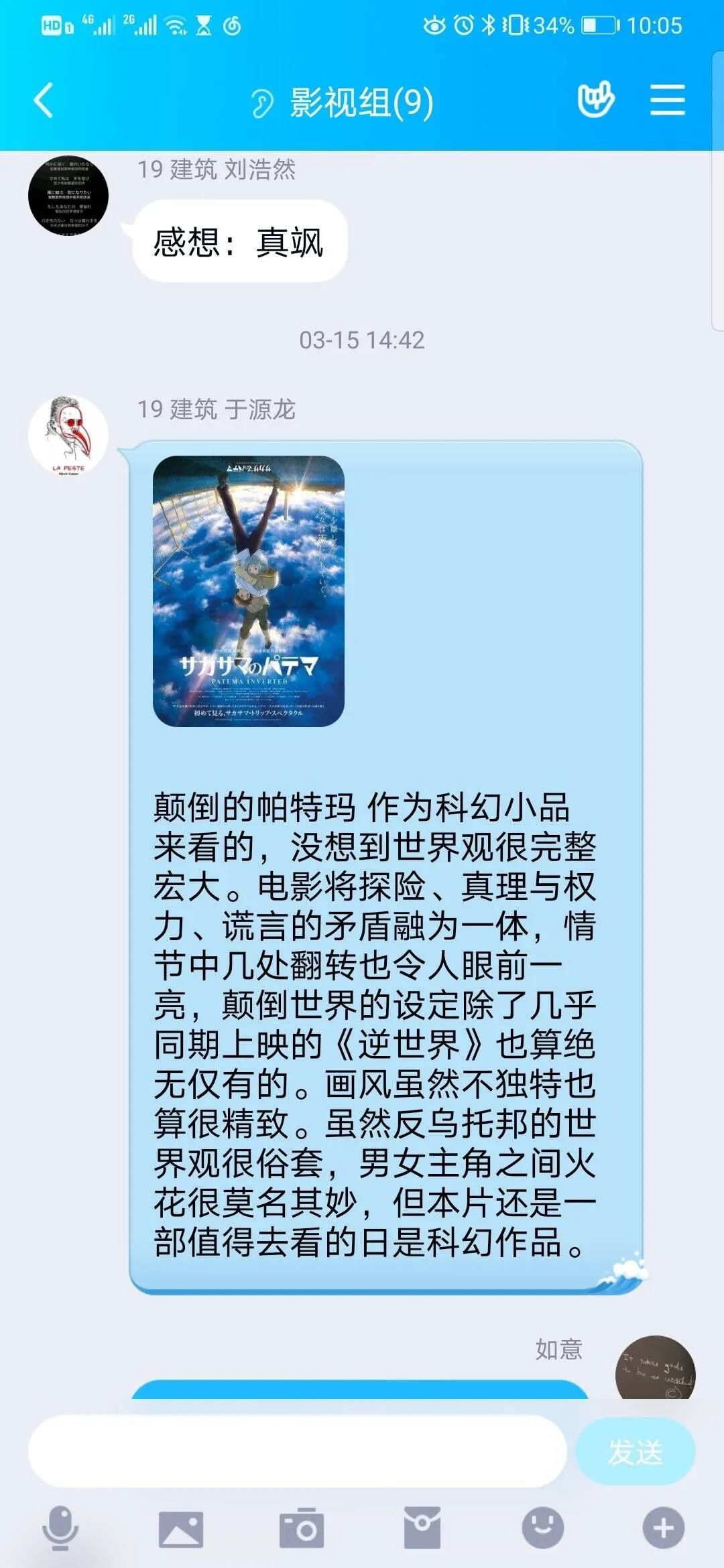 三月中旬,2019级建筑一班刘浩然等九名同学成立影视小组,开展云观影活动,旨在响应国家号召,帮助同学们在家中隔离期间调节心理状态,提高文化素养与生活情趣。